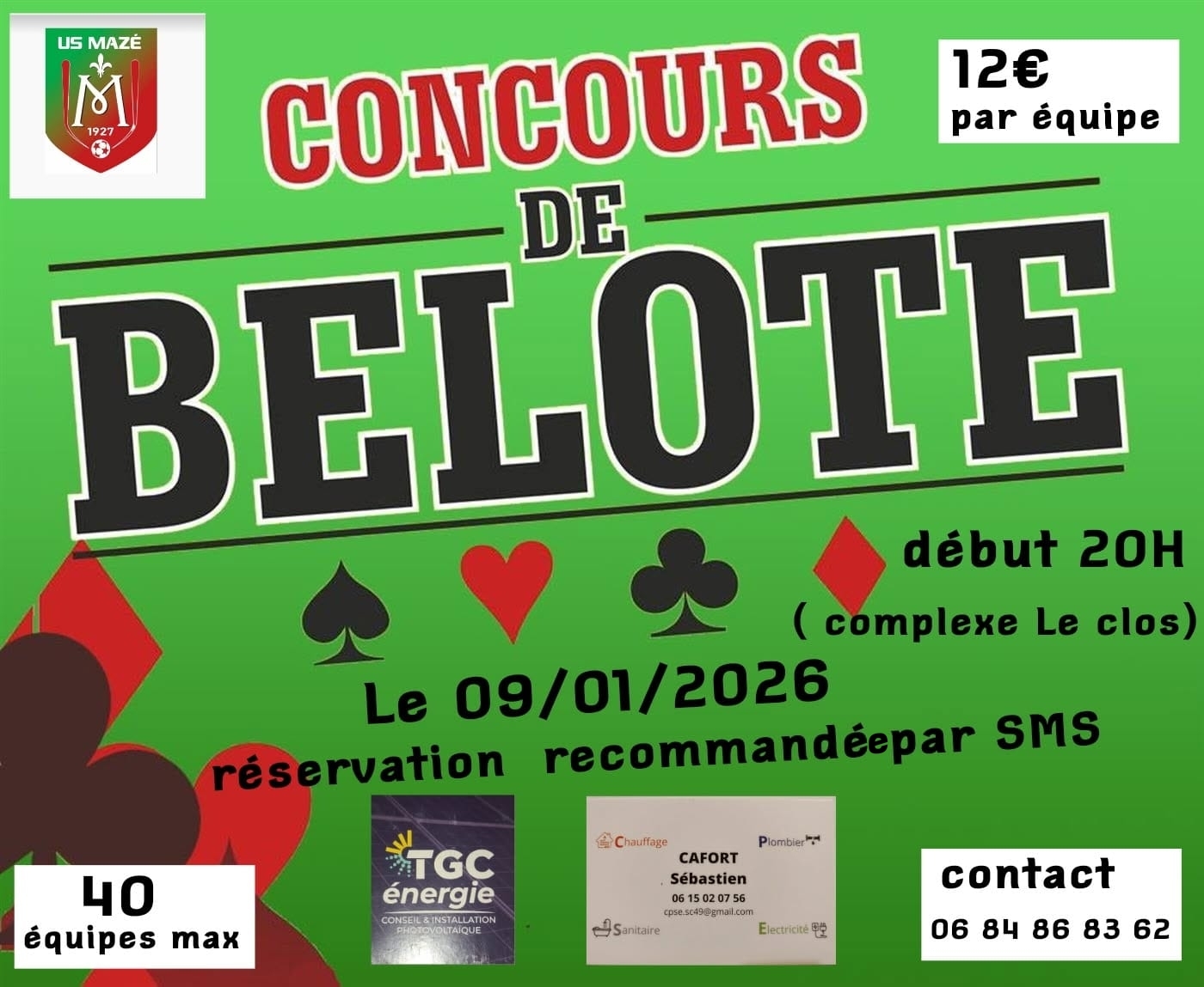 Vendredi 09/01/206 organise un coucours de belote au complexe ( le clos )